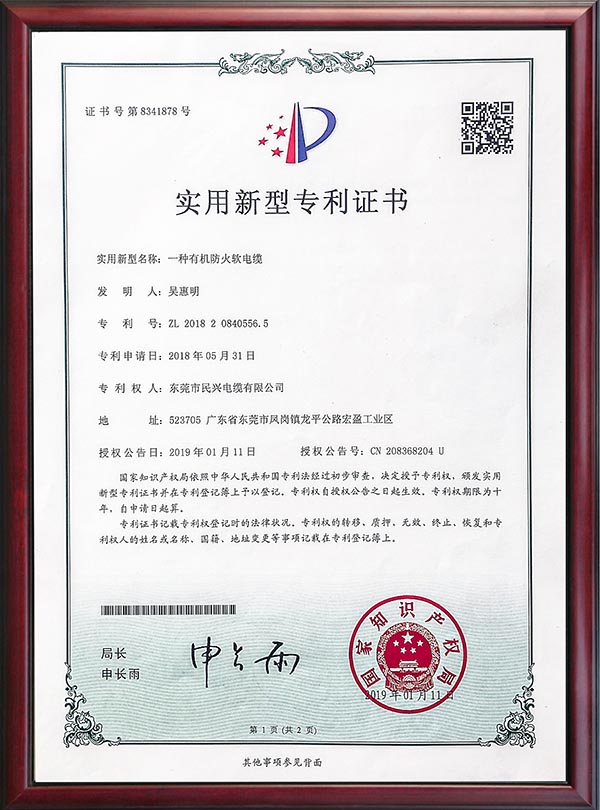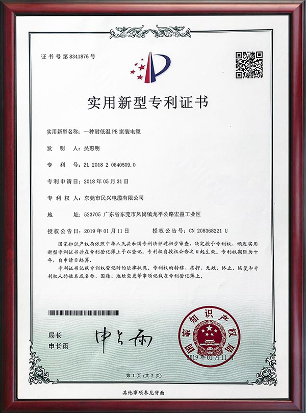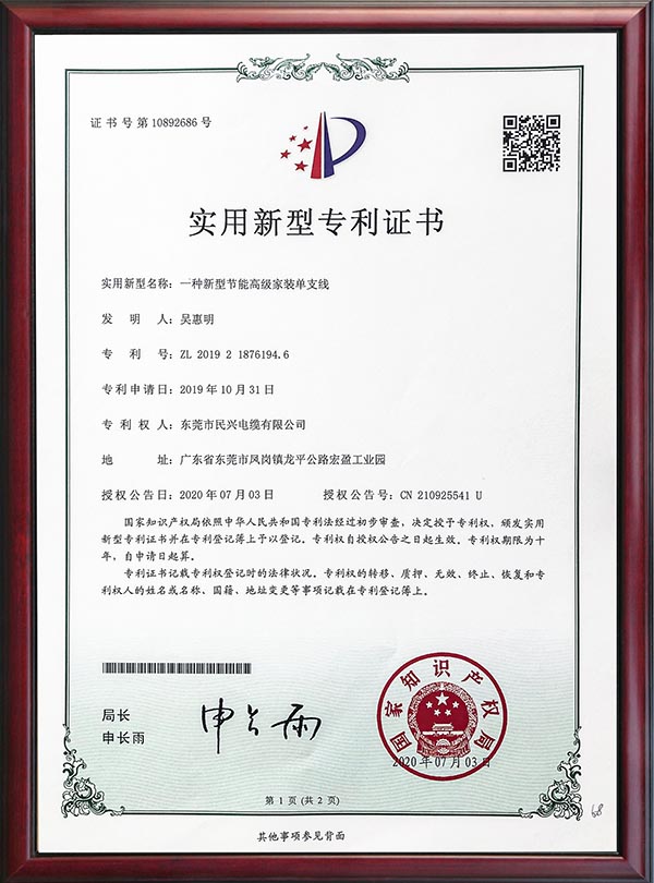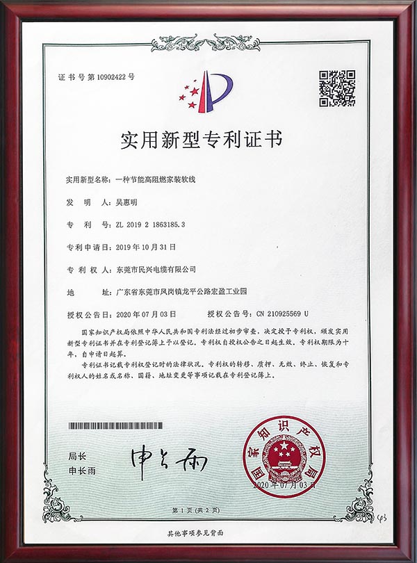 • 專利證書-一種節(jié)能高阻燃家裝軟線