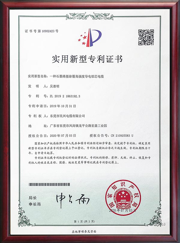 • 專利證書-一種石墨烯基涂覆高強度導電鋁芯電纜