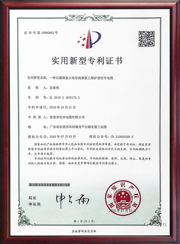 • 專利證書-一種石墨烯符合高導熱聚氯乙烯護套信號電纜