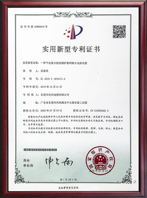 • 專利證書-一種氣電復合波紋銅護套同軸大電流電纜