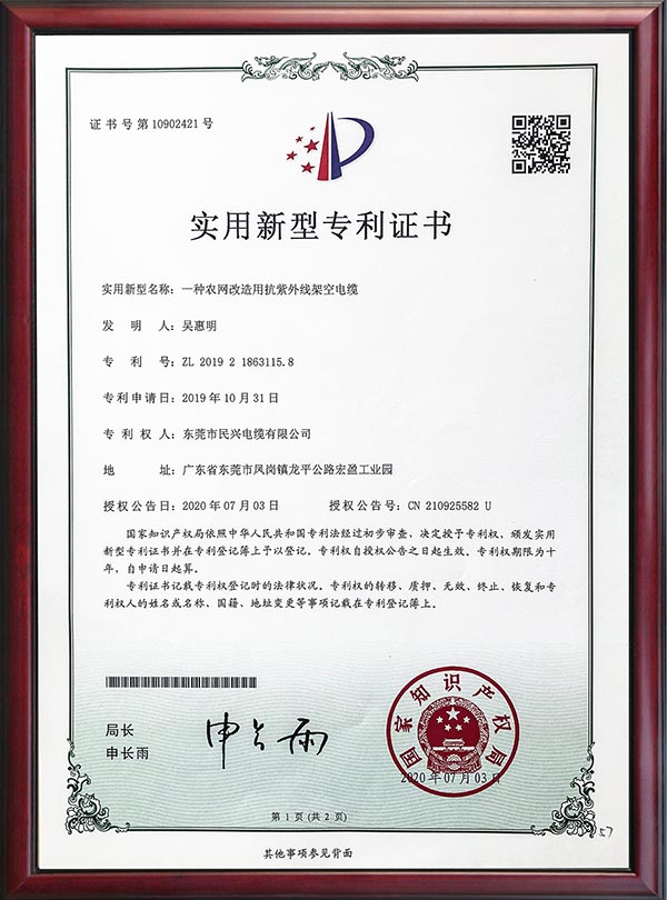 • 專利證書-一種農(nóng)網(wǎng)改造用抗紫外線架空電纜