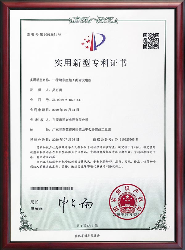 • 專利證書-一種納米型超A類耐火電線