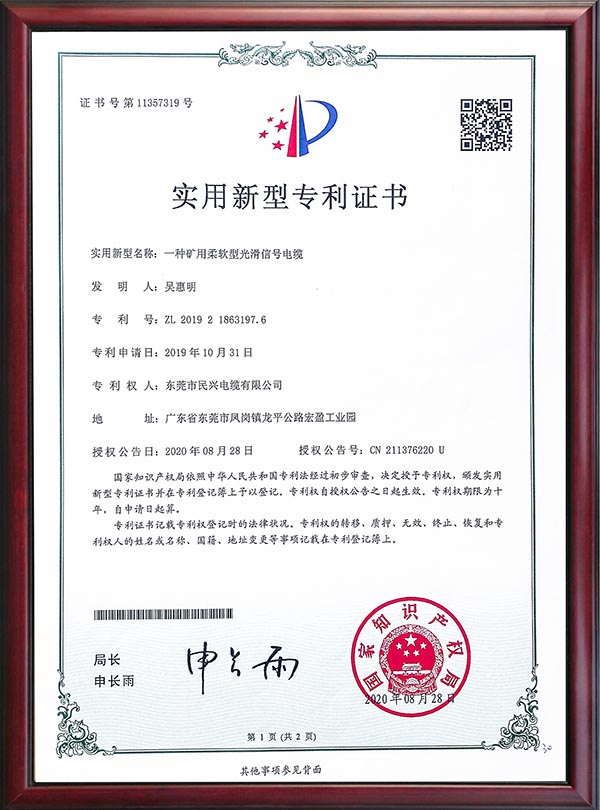 • 專利證書-一種礦用柔軟型光滑信號電纜