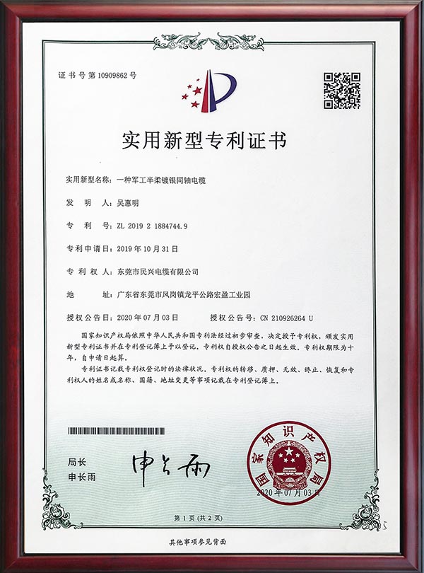 • 專利證書-一種軍工半柔鍍銀同軸電纜