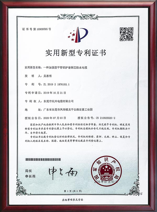 • 專利證書-一種加強型平管鋁護套銅芯防水電纜