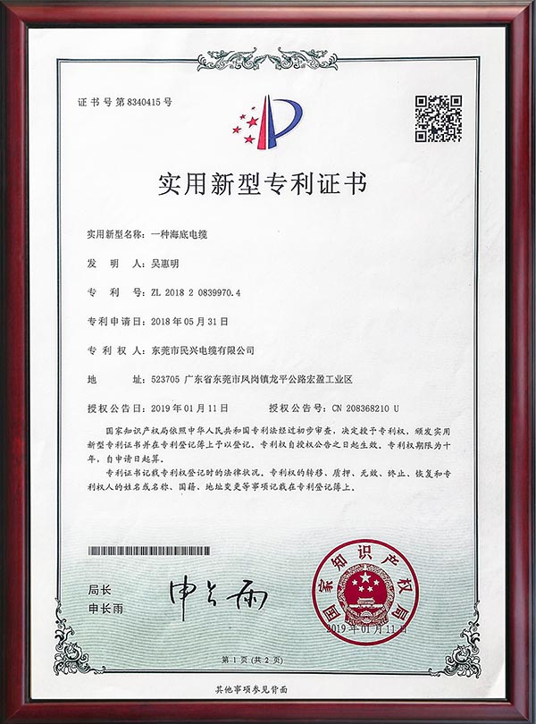 • 專利證書-一種海底電纜-2019