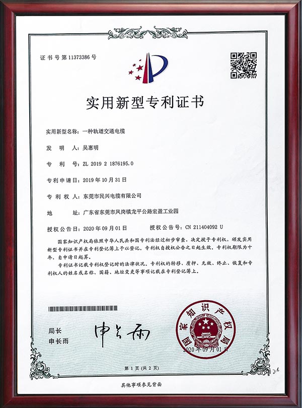 • 專利證書-一種軌道交通電纜