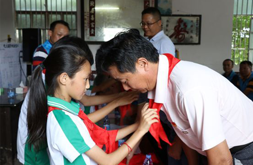 困難學(xué)生為出席捐贈儀式的領(lǐng)導(dǎo)與愛心企業(yè)獻(xiàn)上紅領(lǐng)巾