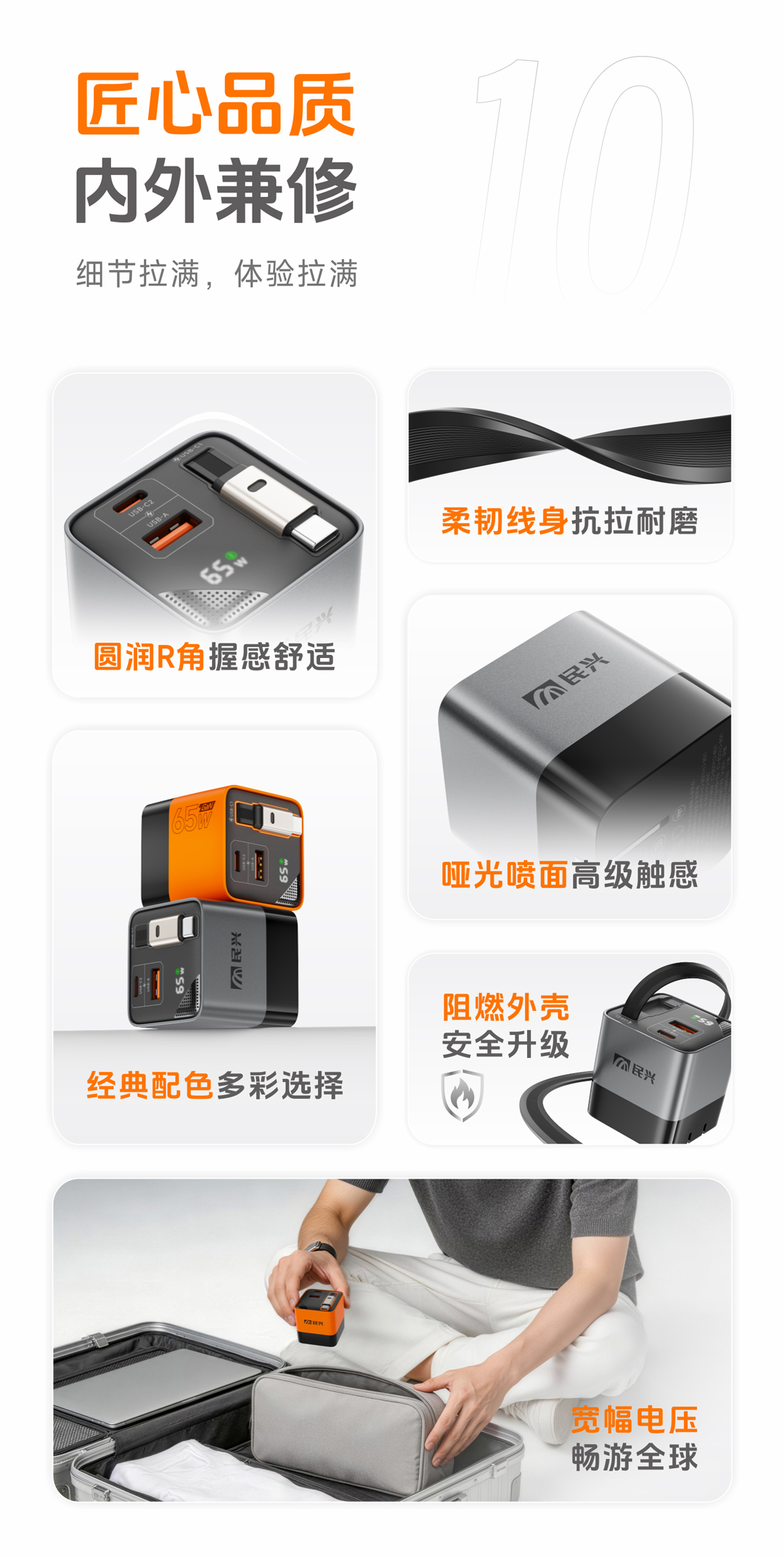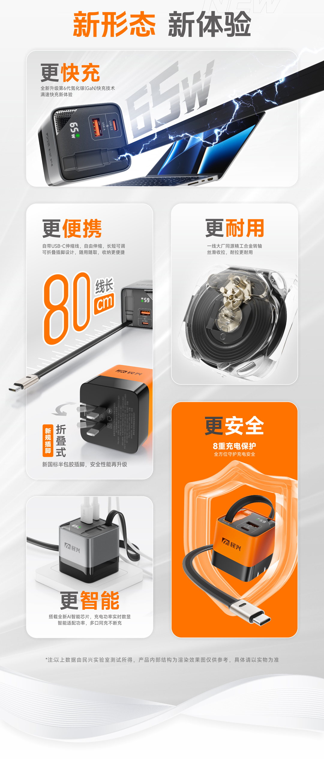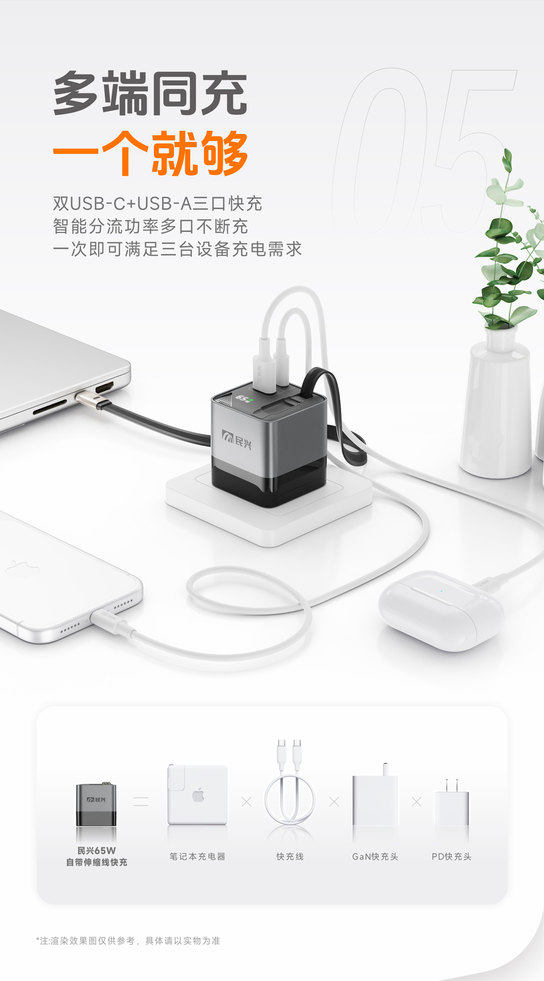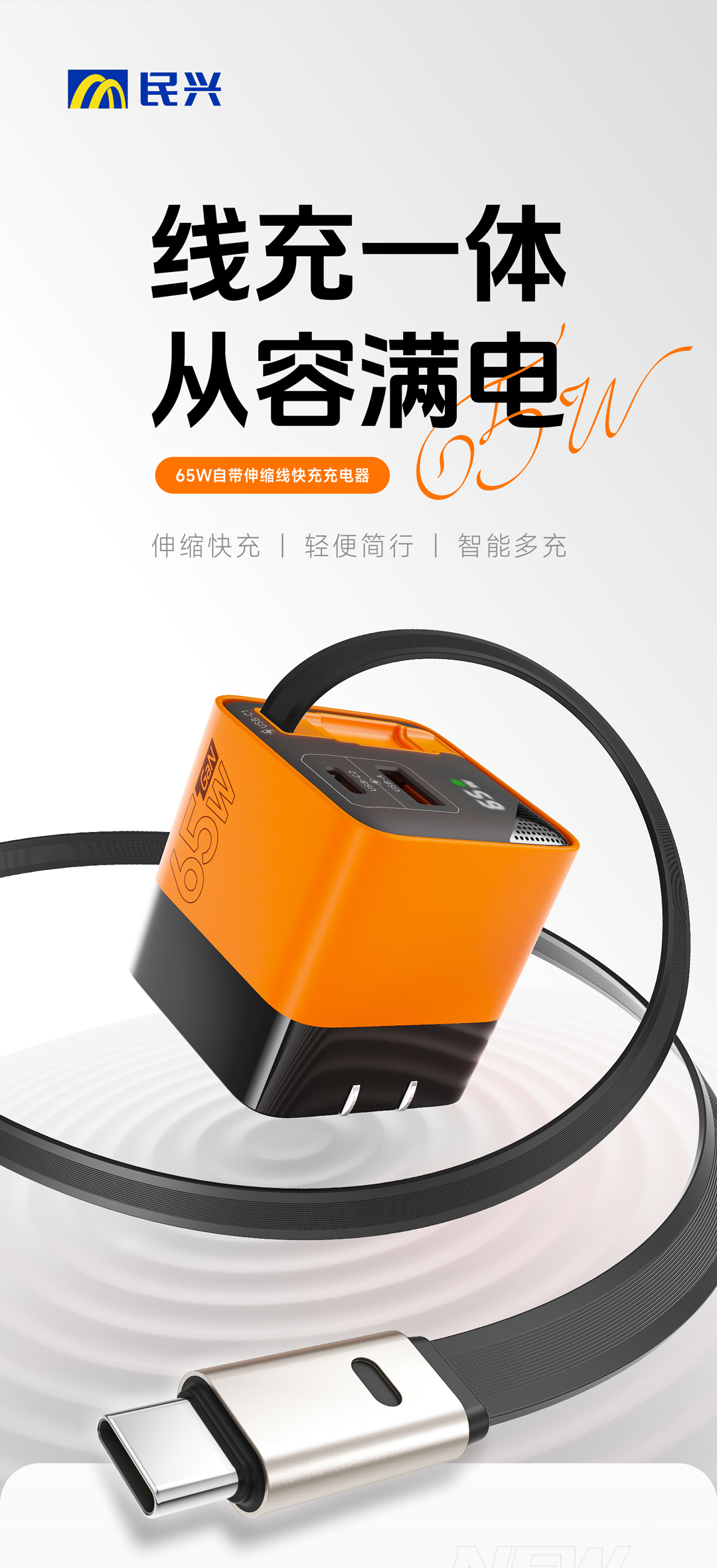 如果你也受夠了差旅途中繁瑣的充電配件,想要更輕松、更高效的出行體驗,那么民興這款65W自帶伸縮線氮化鎵充電器,絕對是你的不二之選。