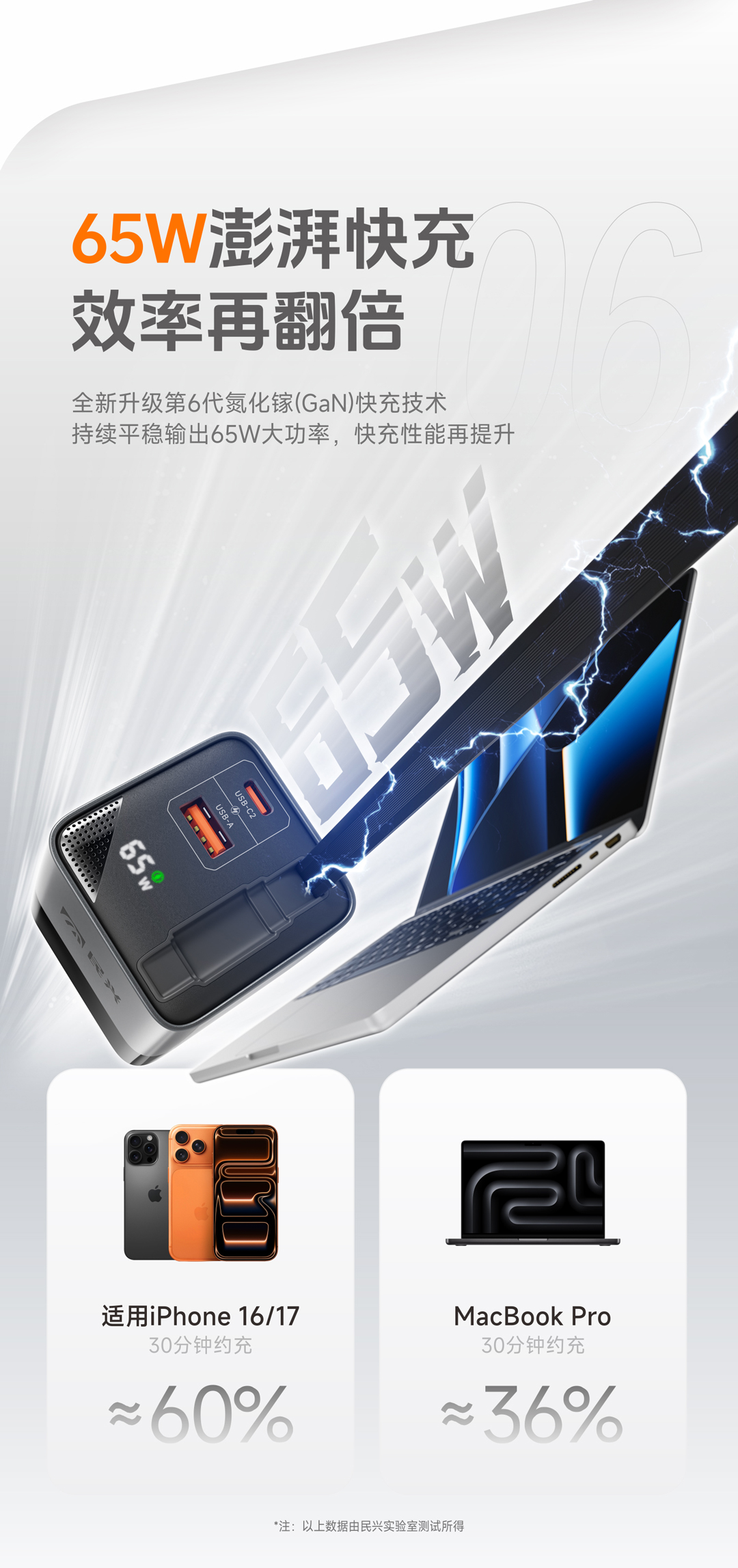 搭載全新升級第6代氮化鎵(GaN)快充技術(shù),發(fā)熱更低,轉(zhuǎn)化效率更高,持續(xù)穩(wěn)定輸出65W大功率,既可給蘋果、安卓、鴻蒙手機快速充電,又能輕松為筆記本快速續(xù)航。