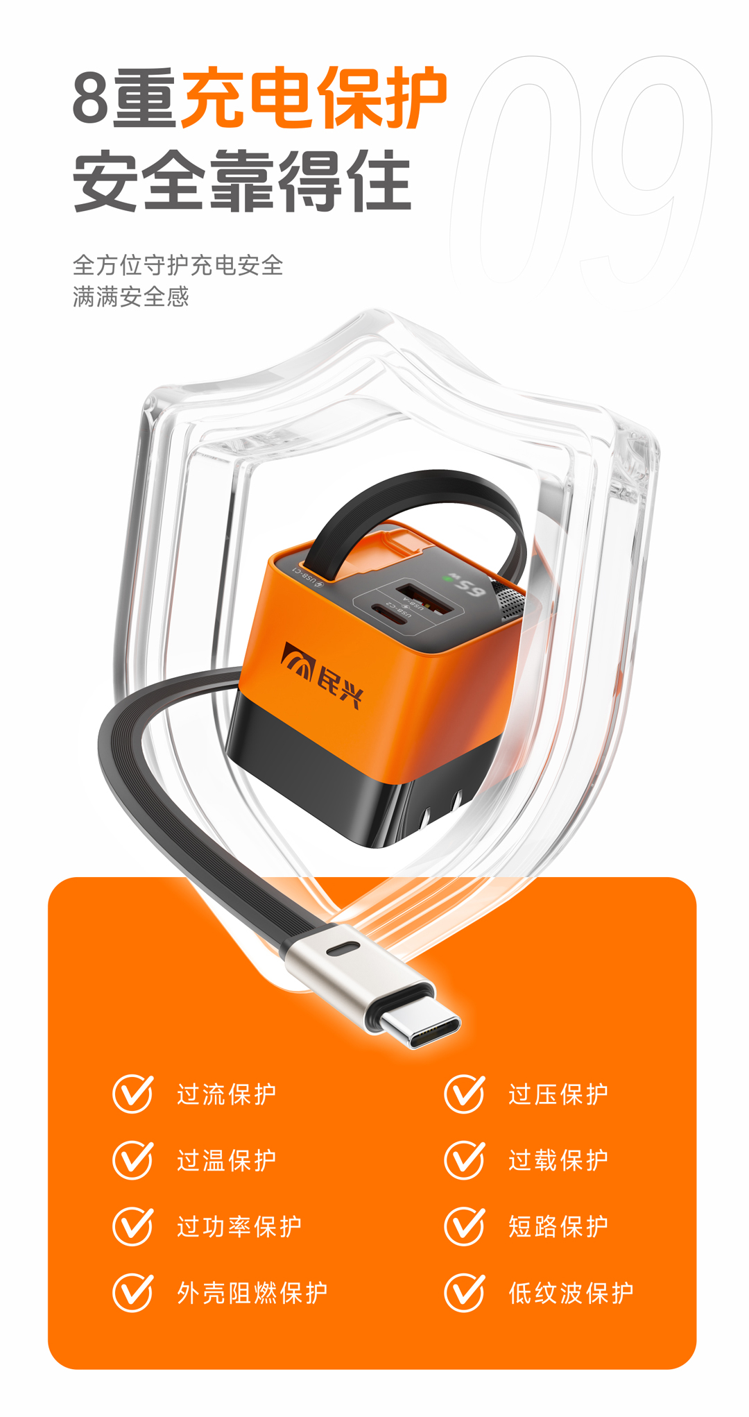 充電安全永遠是首位。內(nèi)置智能保護芯片,提供過流、過壓、過功率、過溫、短路等八重充電保護,全方位守護你的設(shè)備安全。不僅充得快,更充得穩(wěn),讓你每一次充電都安心。